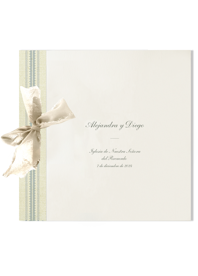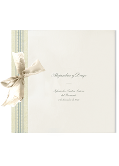 Nuestros libros de firmas tienen unas medidas de 22,5 x 22,5 cm y están compuestos por un mínimo de 18 páginas de 300 gramos hendidas, perforadas y encuadernadas con un lazo.