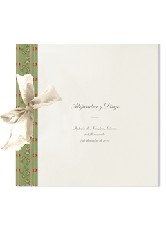 Nuestros libros de firmas tienen unas medidas de 22,5 x 22,5 cm y están compuestos por un mínimo de 18 páginas de 300 gramos hendidas, perforadas y encuadernadas con un lazo.