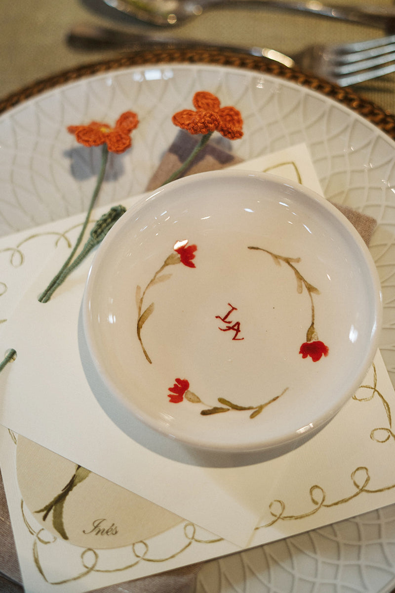 Descripción del producto: Pack de platitos de cerámica de la marca artesana Duplat con diseño de colección de flores e iniciales personalizadas.