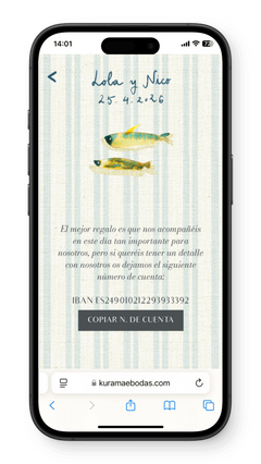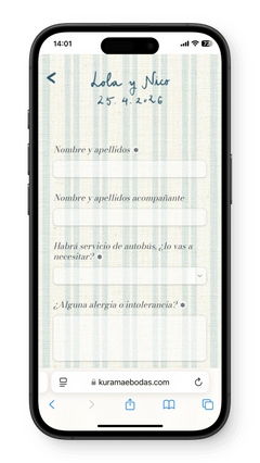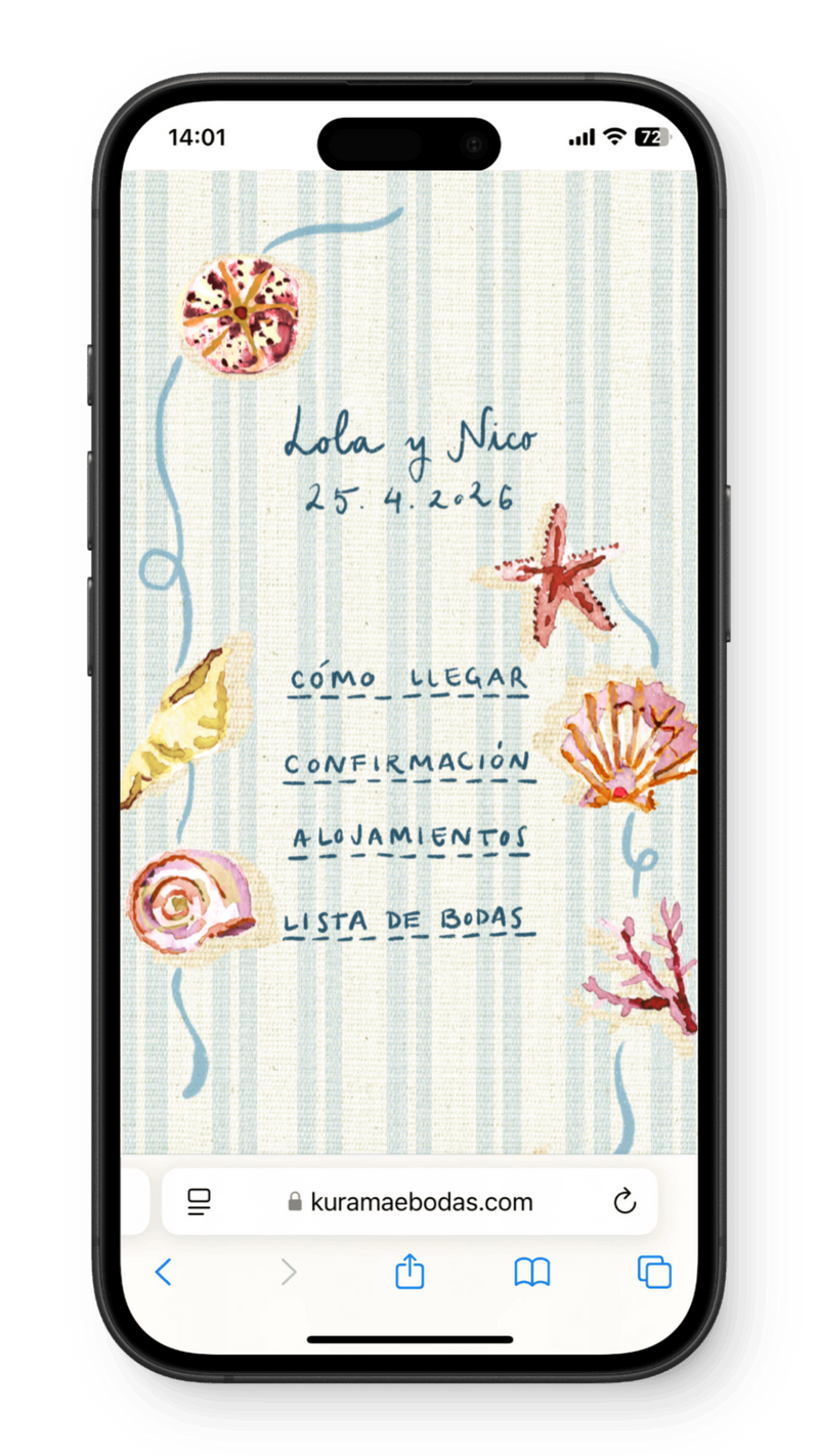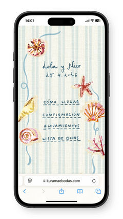 -5 PÁGINAS INCLUIDAS EN LA WEB: Home, Cómo llegar, Confirmación, Alojamientos y Lista de Bodas (cualquier apartado diferente a estos deberá añadirse al pedido como página extra)